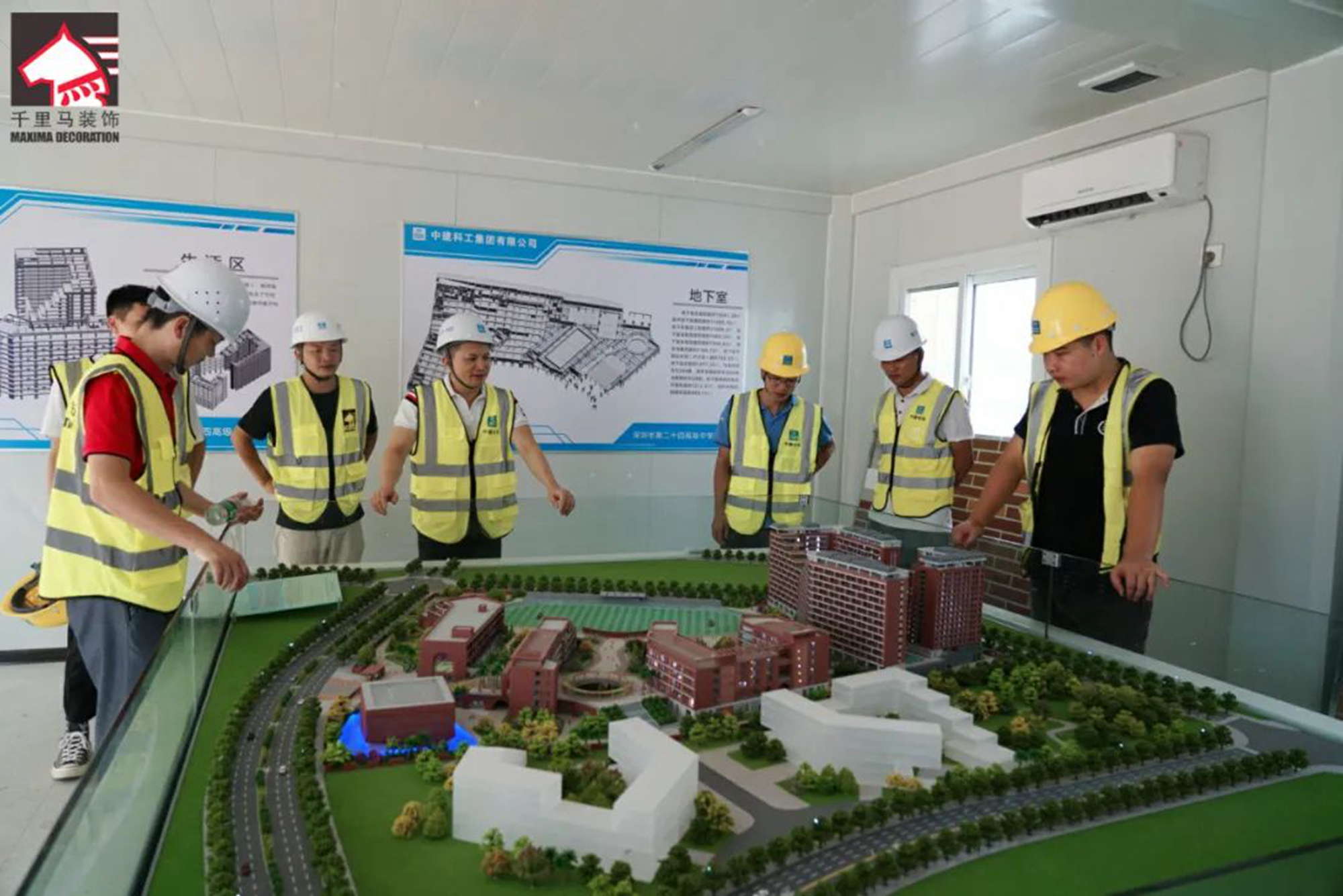隨后一行人來到深圳市第二十四高級中學新建工程項目(一標段:宿舍樓),項目位于深圳市寶安區沙井街道民主大道西側盡頭處北側,建筑面積大約47000㎡;學生宿舍3F至13F共505間,教師宿舍3F至15F共228間及配套所有公共區域(宿舍樓2F以上和對應的外墻)實際工期為2021年9月15日2022年1月20日(共127天),工作面大,施工時間少,所以要求項目需要穿插施工、交叉施工。李董表示,項目要極速搶工施工,水平與垂直立體分段,幕墻、機電、精裝穿插施工,精裝報驗、精裝竣備,按期交付驗收。