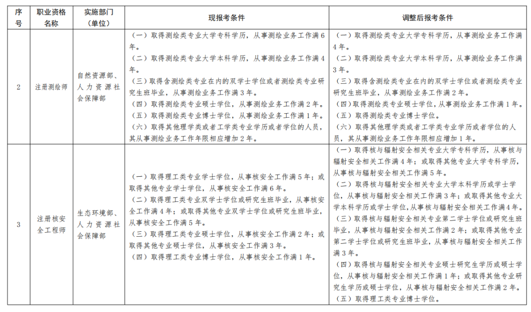 變化:取消了畢業(yè)后的總工作年限要求,除了碩士學(xué)歷外,其他學(xué)歷從事工程類工作年限不變,總體還是降低了要求的。
