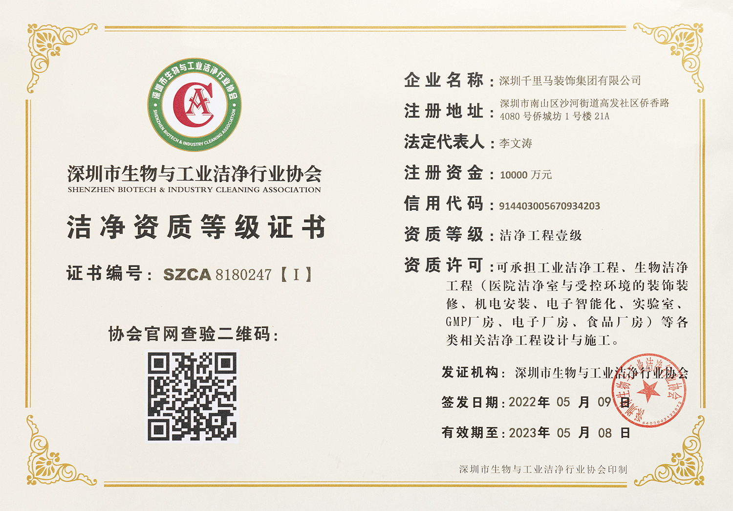 近日,千里馬裝飾集團取得潔凈工程壹級資質,成為深圳市生物與工業(yè)潔凈行業(yè)協(xié)會會員單位。該資質可承接工業(yè)潔凈工程、生物潔凈工程(醫(yī)院潔凈室與受控環(huán)境的裝飾裝修、機電安裝、電子智能化、實驗室、GMP廠房、電子廠房、食品廠房)等各類相關潔凈工程設計與施工,該資質的取得標志著千里馬裝飾集團正式進入潔凈行業(yè)市場,特別是醫(yī)院細分市場的專業(yè)設計與施工承接。