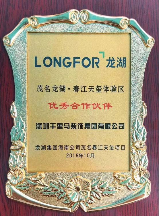 龍湖·春江天璽是龍湖集團首入茂名打造的主城最高端品質(zhì)酒店式尊享社區(qū),深圳千里馬裝飾集團作為承建單位不負眾望,將其營銷中心體驗區(qū)及樣板房建設得盡善盡美,無其倫比。因此,龍湖集團授予深圳千里馬裝飾集團“優(yōu)秀合作伙伴”獎牌以示感謝。