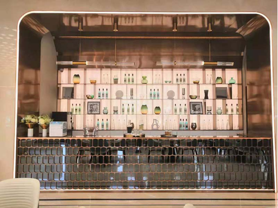 收銀臺背景采用的是定制墻紙,整個畫面寬幅比較大。