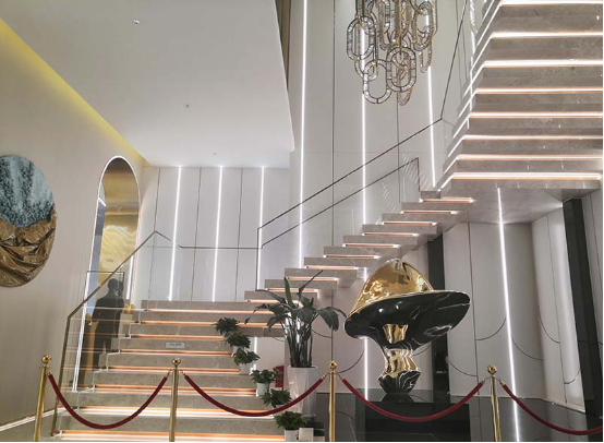 營銷中心體驗區(qū)的施工特點及難點主要在于異形不銹鋼的施工、材料種類多導致加工工序多、石材旋轉(zhuǎn)樓梯難度大等方面,深圳千里馬裝飾集團有限公司施工隊伍不畏困難,堅持“工匠精神”不動搖,把品質(zhì)、工期和客戶滿意度放在第一位,給客戶提交了一份滿意的答卷。