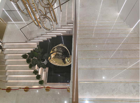 其次是石材旋轉(zhuǎn)樓梯,設計排版要求高,安裝工藝精細。