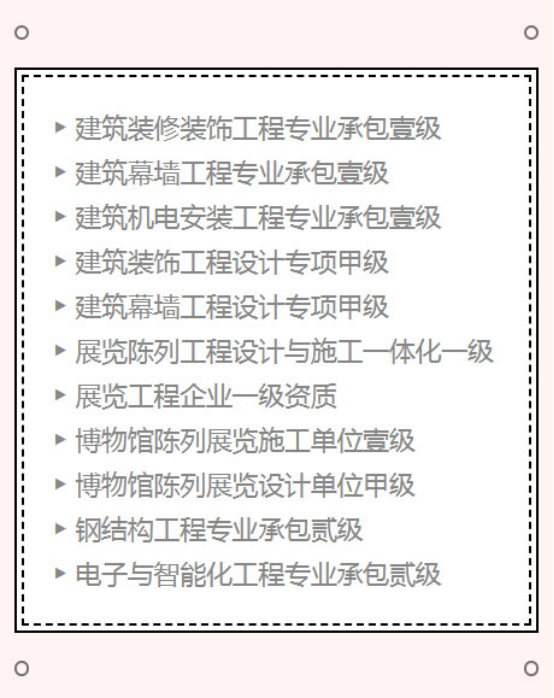 現(xiàn)在,深圳千里馬裝飾集團(tuán)已經(jīng)形成以建筑裝飾裝修工程為核心,建筑幕墻工程、智能化工程、鋼結(jié)構(gòu)工程、展陳工程等領(lǐng)域齊頭并進(jìn)的格局,是集策劃、設(shè)計(jì)、施工、軟裝為一體的裝飾整體服務(wù)提供商。現(xiàn)持有資質(zhì)如下: