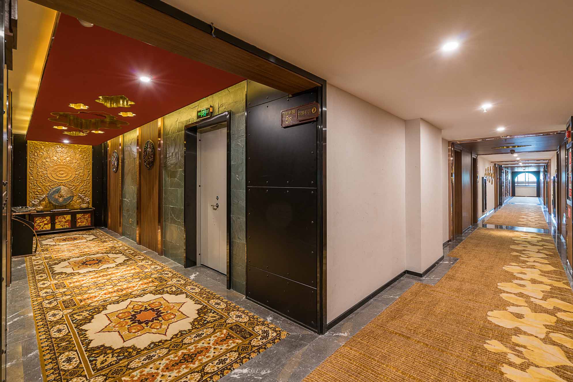 在電梯廳的設(shè)計(jì)上,紅色的天花、金色的墻體、金色的地毯,和整個(gè)酒店的泰式風(fēng)格相輔相成,在邊幾上擺放富有泰式風(fēng)情和佛教感覺的金色擺件,給人一種驚喜的感覺。