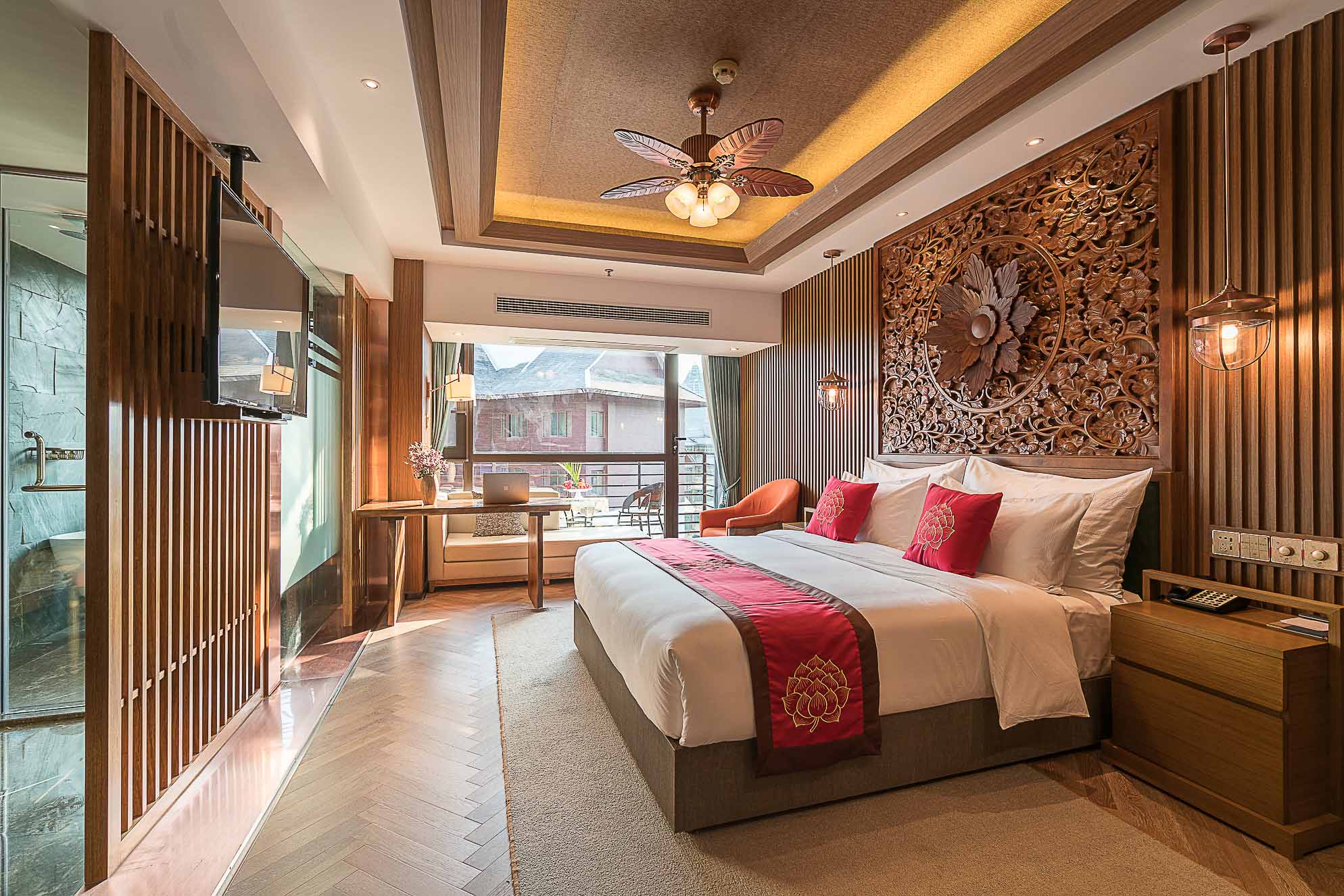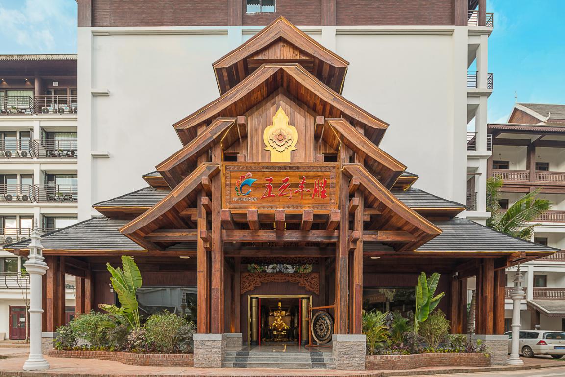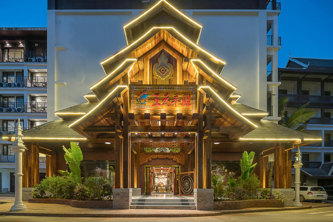 在酒店的門頭設(shè)計(jì)上,沿用佛教國家泰國的“多層屋頂”的結(jié)構(gòu)設(shè)計(jì),給人向外伸展、莊重大氣的美感。