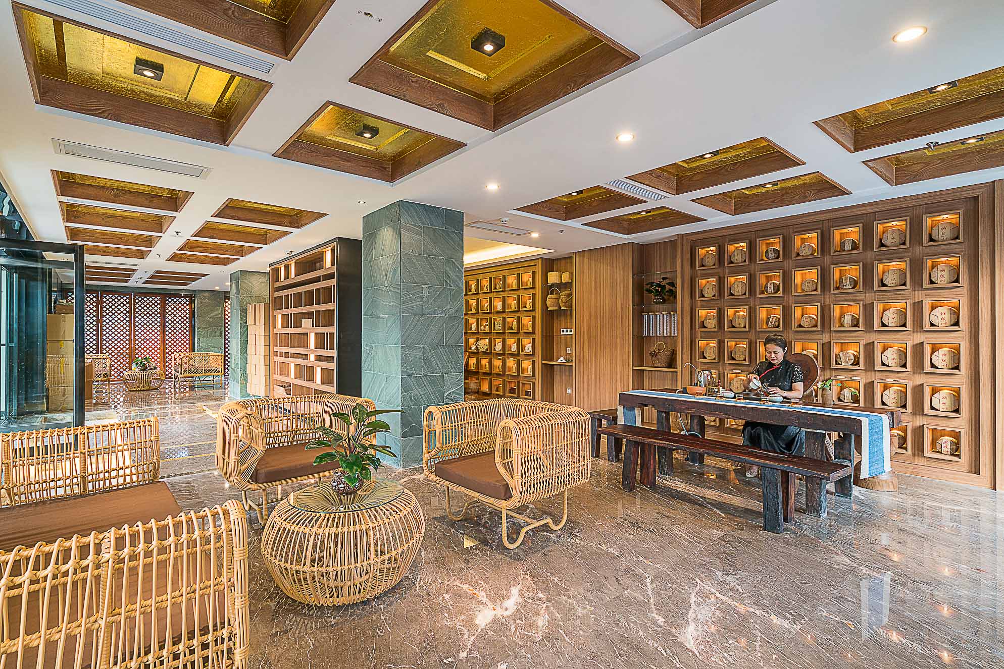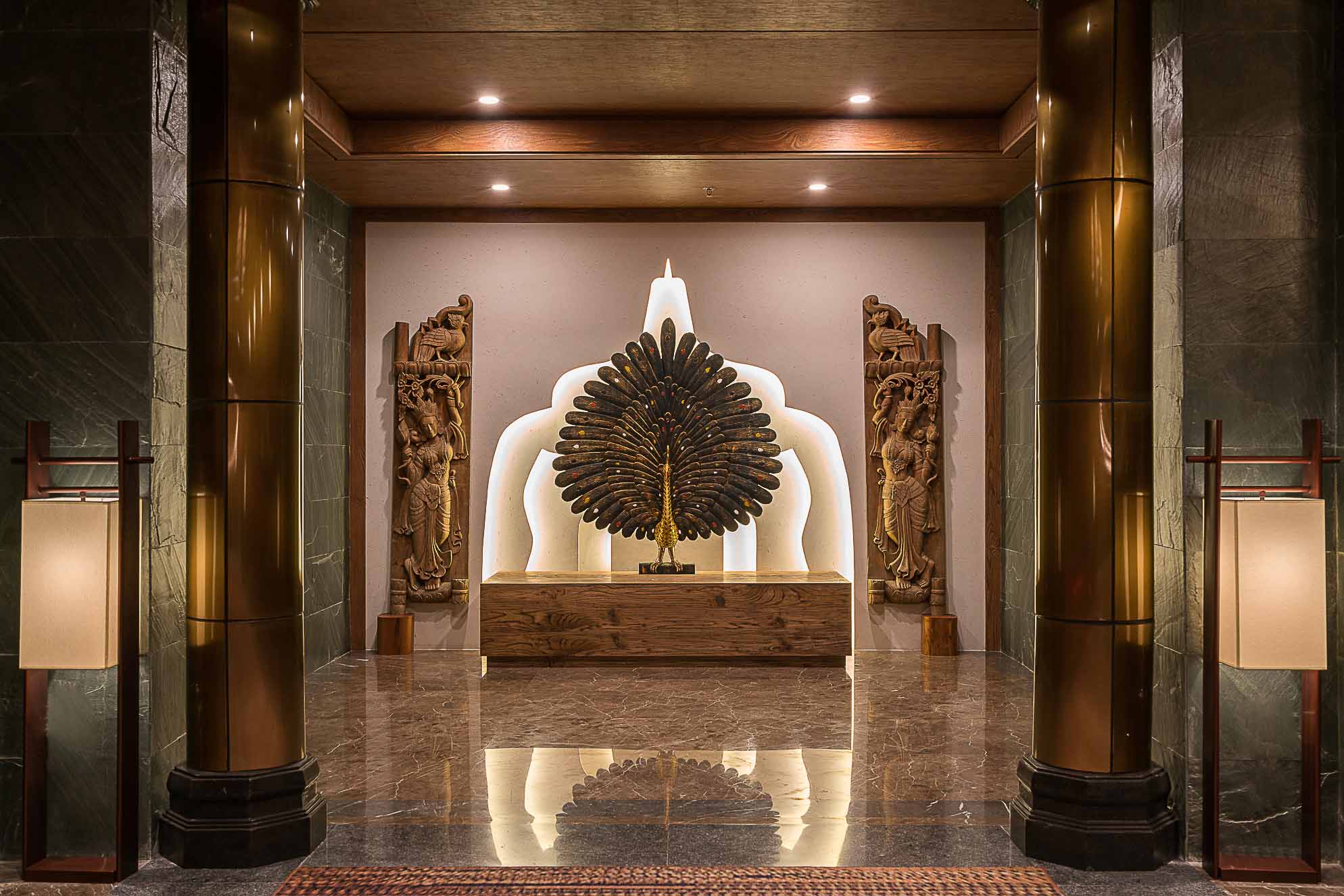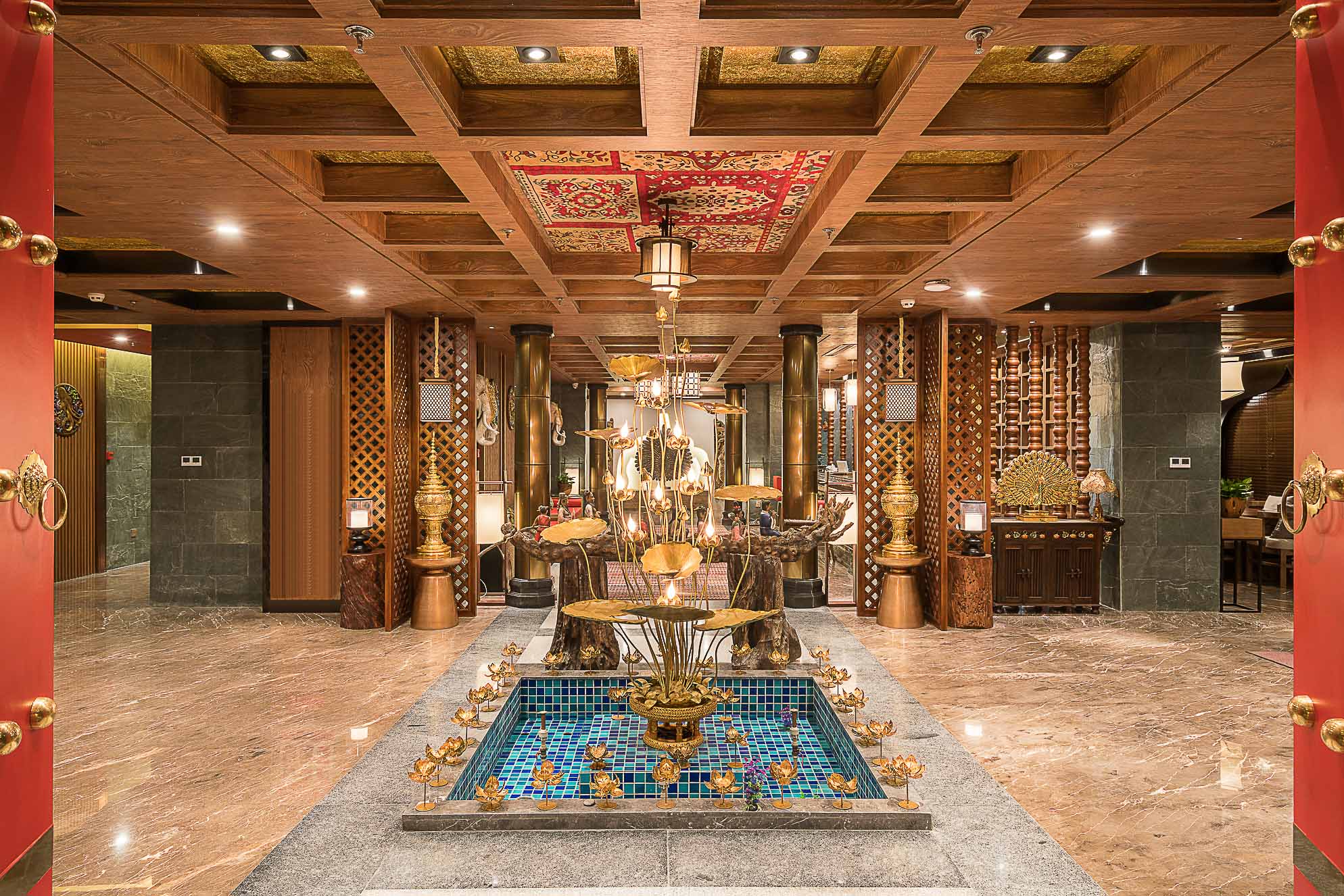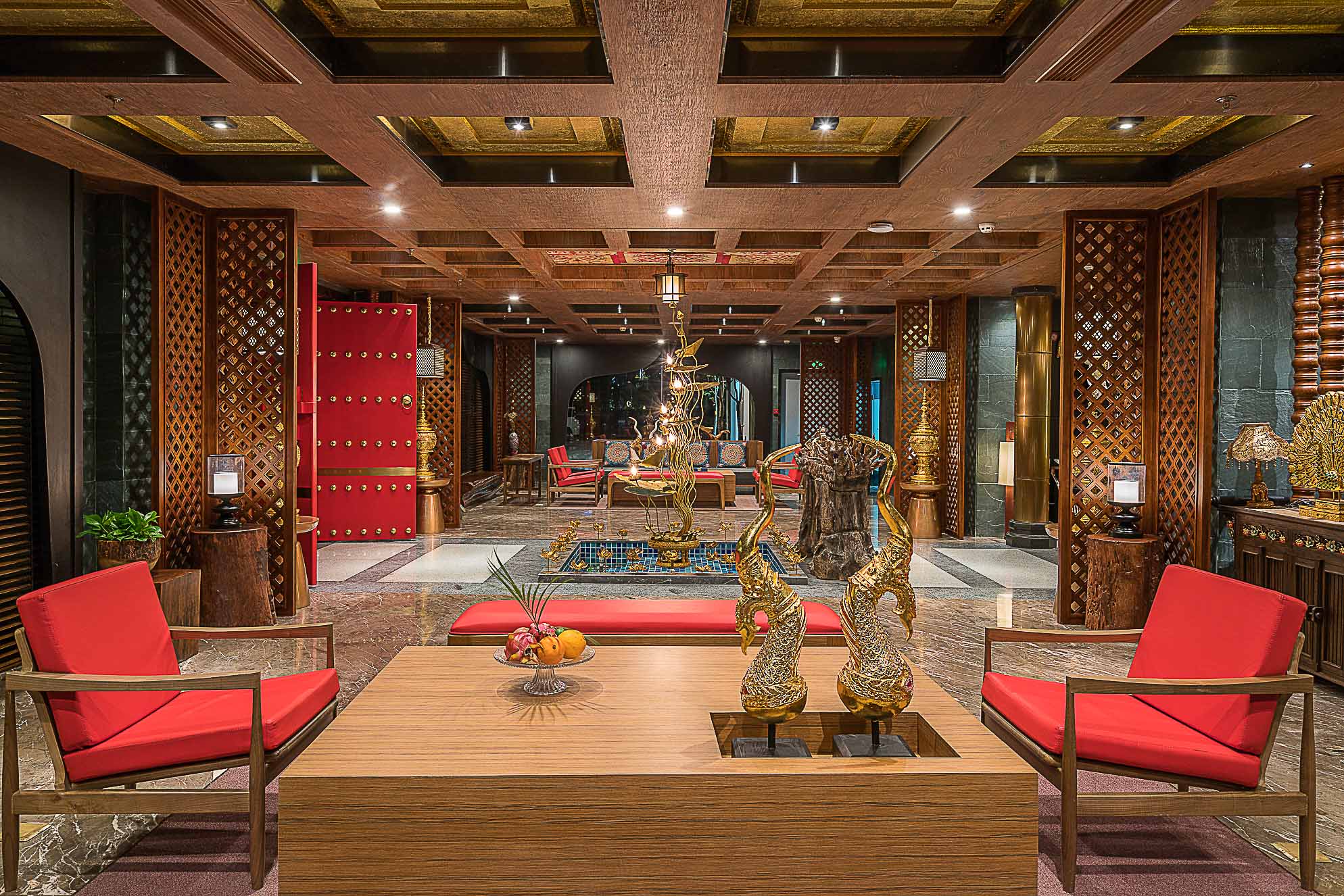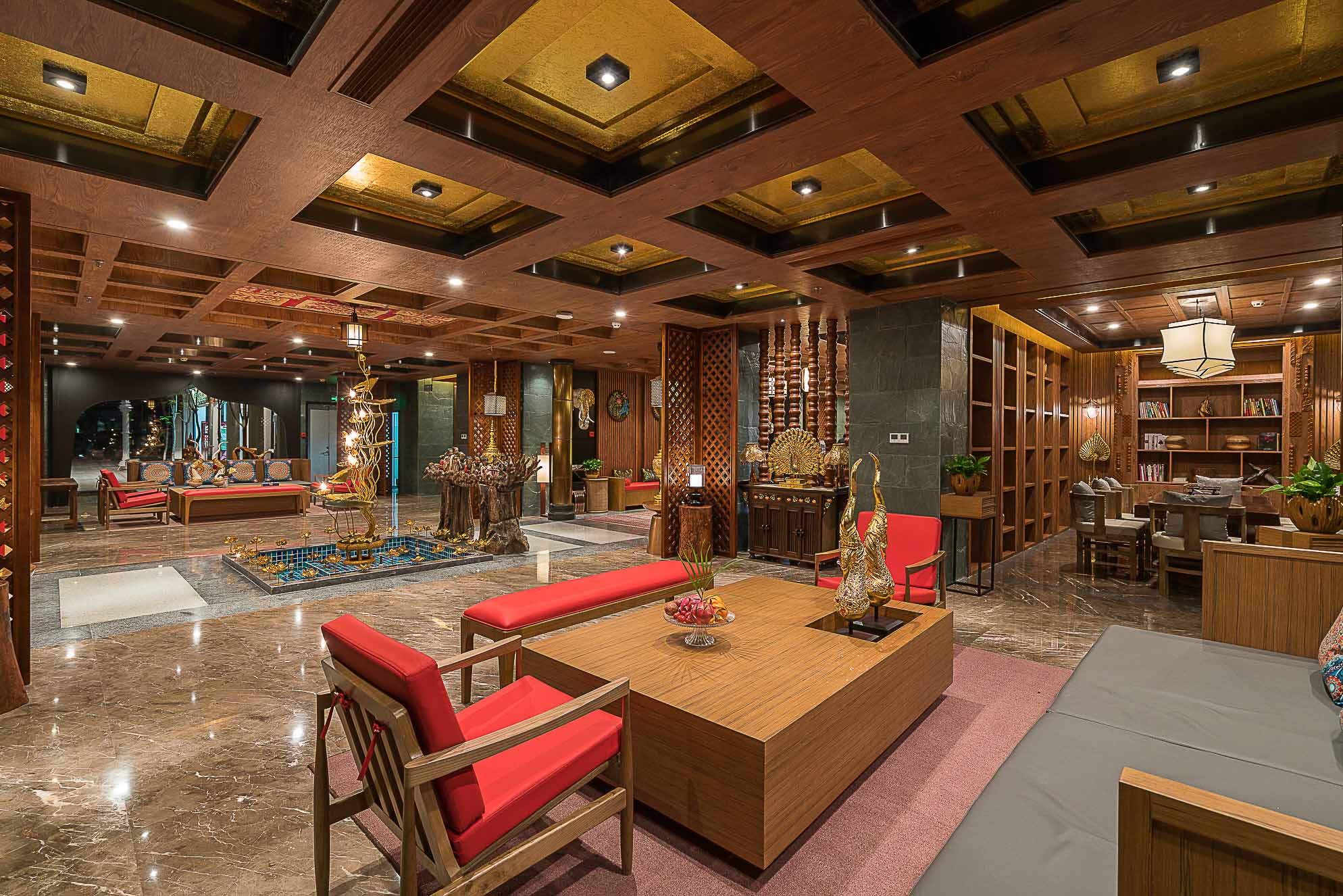 在大堂的設(shè)計(jì)上,整體以深褐色、金色、暗紅色為主,多選用實(shí)木材質(zhì)和金色的金屬,整個(gè)空間既穩(wěn)重,又能透出一種奢華之感。加上富有東南亞氣息的蓮花、孔雀及有佛教元素的擺件,使整個(gè)大堂也顯示出一種異域的神秘感。